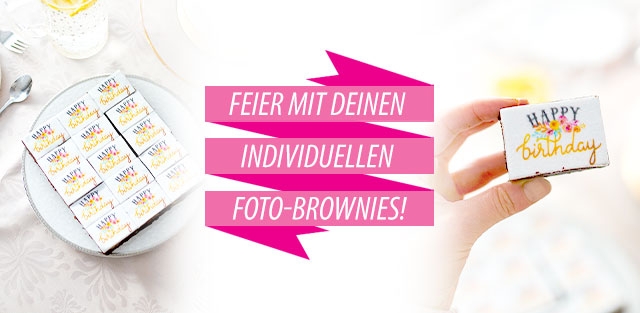 Unsere Brownies zeichnen sich durch ihren schokoladigen und intensiven Geschmack aus und zusätzlich mit Walnüssen gefüllt. Die Brownies sind 6x4cm groß und 3cm hoch. Sie können mit Fotos, Motiven oder Logos versehen werden, die originell auf leckeren Odense-Marzipan mit Lebensmittelfarbe gedruckt werden. Auf unsere Brownies kann fast alles gedruckt werden. Wahre Schokoliebhaber werden nicht genug davon kriegen! Bereite jemandem eine einzigartige und unvergessliche Überraschung in Form kleiner Snacks! deineTorte.de garantiert einen Wow-Effekt. Bestelle schon heute deine Fotobrownies, nach Bedarf mit einer individuellen Aufschrift und begeistere deine Gäste! Hier geht es zu unseren: BrowniesTörtchen